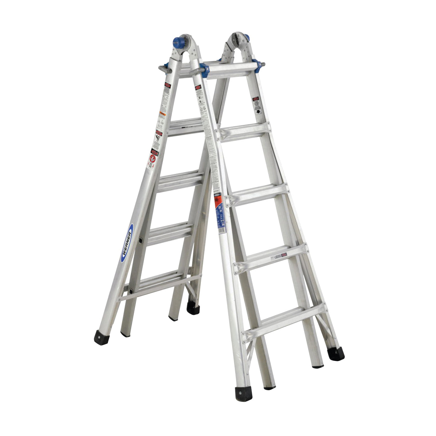 The lightweight MT-22 telescoping 22 ft reach multiladder is versatile and easy to transport. The adjustable telescoping design allows the ladder to be used in five different positions, twin step ladder, stairway step ladder, extension ladder, wall ladder and as two scaffold bases. In the step ladder mode, this hybrid ladder can be used for one or two person jobs with a duty rating of 300 lb per side. The feet are slip-resistant and the ends of the multi-position ladder are flared for firm support. Smooth curved rails allow for comfortable climbing. With its many uses, this multiladder fits all your climbing needs.