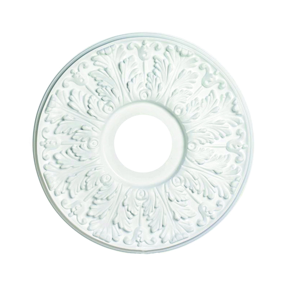 Add a charming accent to your interior decor with the Victorian white finish ceiling medallion. This medallion features a lovely Victorian-style pattern on a clean white finish. The simple installation of this medallion is a great way to hide a hole if an opening in the ceiling is cut too large. It can also hide ceiling blemishes and cracks that may appear around ceiling fans and lighting fixtures. The medallion is made of durable molded plastic.