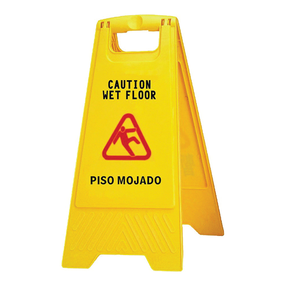 Lightweight. Message printed on both sides, "CAUTION WET FLOOR" and "PISO MOJADO". 8 in by 2 in on top of sign and 24 in long.
