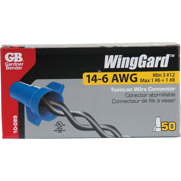 GB's WingGard™ twist-on wire connectors offer unsurpassed quality and durability in a high-leverage, easy-on, wing-type design. These hardworking connectors offer a wide range of connection options essentially ensuring that one size can do the job of multiple standard connectors. The swept wings provide added turning torque and reduce the strain of multiple applications. The thermoplastic shell provides strength and resistance to chemicals while a long skirt prevents exposure of bare wire. The zinc-plated square wire-spring inside instantly adjusts to the shape and size of the splice upon insertion ensuring a long-lasting connection that resists corrosion and exceeds UL standards for dielectric strength and wire pullout force.