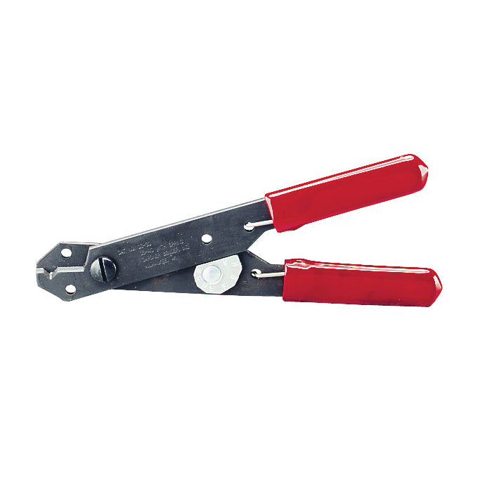 This tool cuts copper and aluminum solid or stranded wire. Rotate the cam wheel adjustment to strip appropriate 10 to 24 AWG wire. Holes in the side of the jaws are intended for looping solid wire. Compact tool adjusts quickly to any of eight wire sizes.