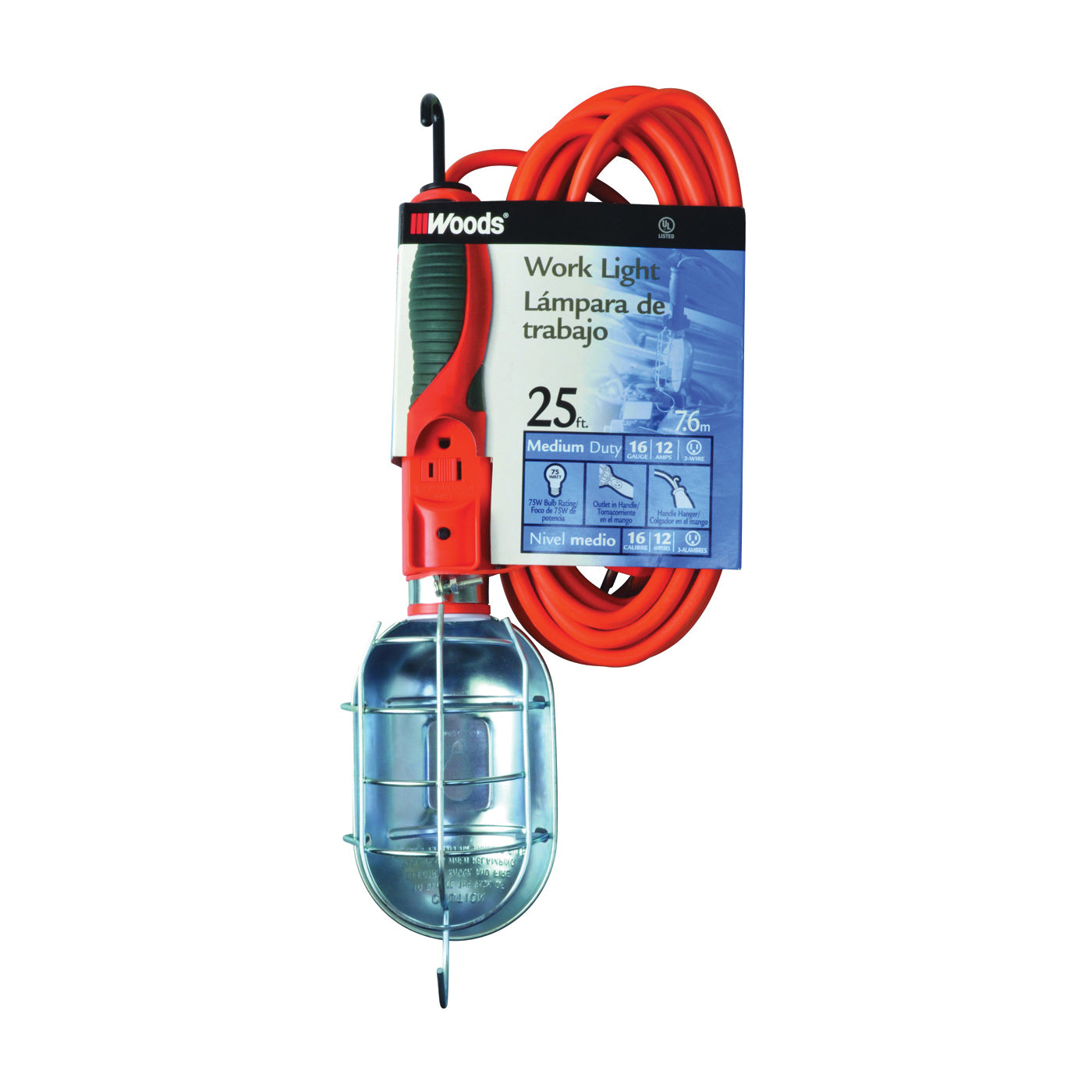 Patented dual hook system, hang by the guard or handle. Heat-resistant housing stays cool even with short neck bulbs. Round flexible vinyl jacket. Meets OSHA specifications for temporary lighting. UL-rated for 75 W maximum bulbs. UL listed. Orange cord. Sleeved.