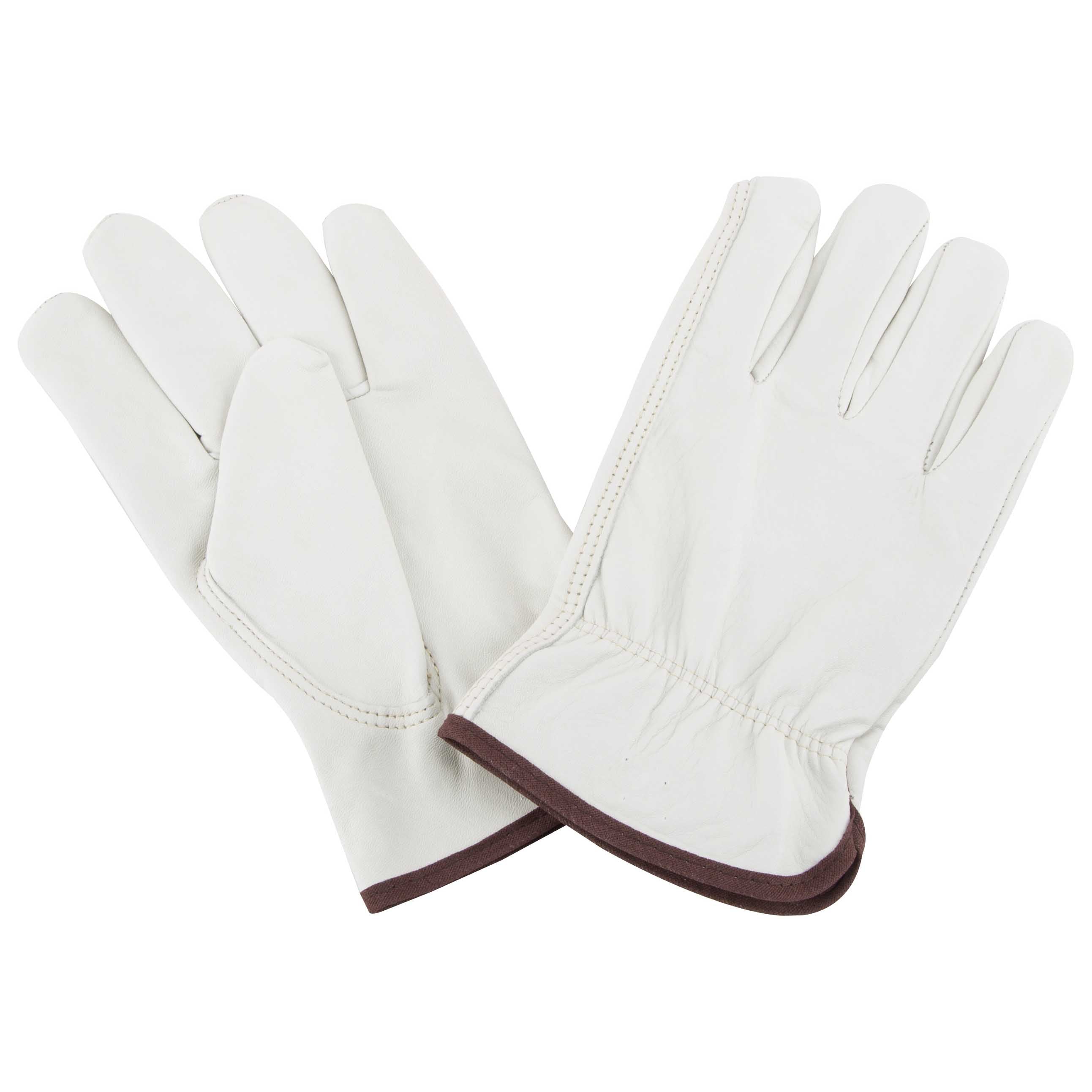 Cream color, grain leather driving gloves feature Keystone thumb and shirred elastic back. Size: L.