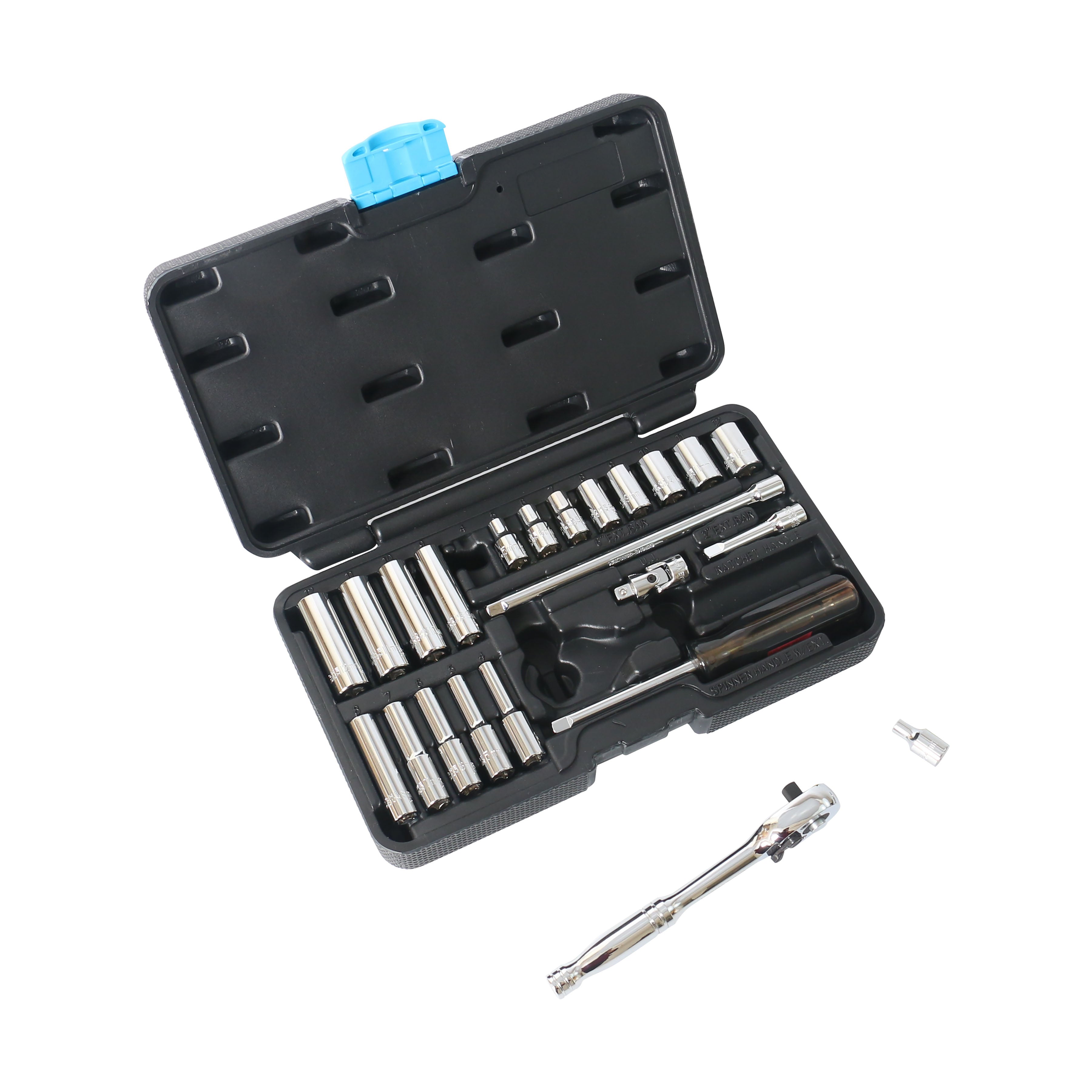 | Includes | (1) 9 PCS: 1/4 in Drive 6 PT Deep Sockets: 3/16 in, 7/32 in, 1/4 in, 9/32 in, 5/16 in, 11/32 in, 3/8 in, 7/16 in, 1/2 in, (3) 1 PC: 1/4 in Drive Universal Joint, (4) 1 PC: 1/4 in Drive 2 in Extension Bar, (5) 1 PC: 1/4 in Drive 6 in Extension Bar, (6) 1 PC: 1/4 in Drive 6-1/2 in Quick Release Ratchet Handle with Snap on Type, (7) 1 PC: 1/4 in Drive 6 in Spinner Handle with Extension, (8) 1 PC: 1/4 in Drive Coupler Adaptor, (9) 10 PCS: Bits 1 in (L) with PVC Holder, S2: 2 PC-Phillips #1,#2, 2 PC-Slotted 4, 5.5 mm, 6 PC-Star T10,T15,T20,T25,T27,T30 and (10) 1 PC: Blow Case |