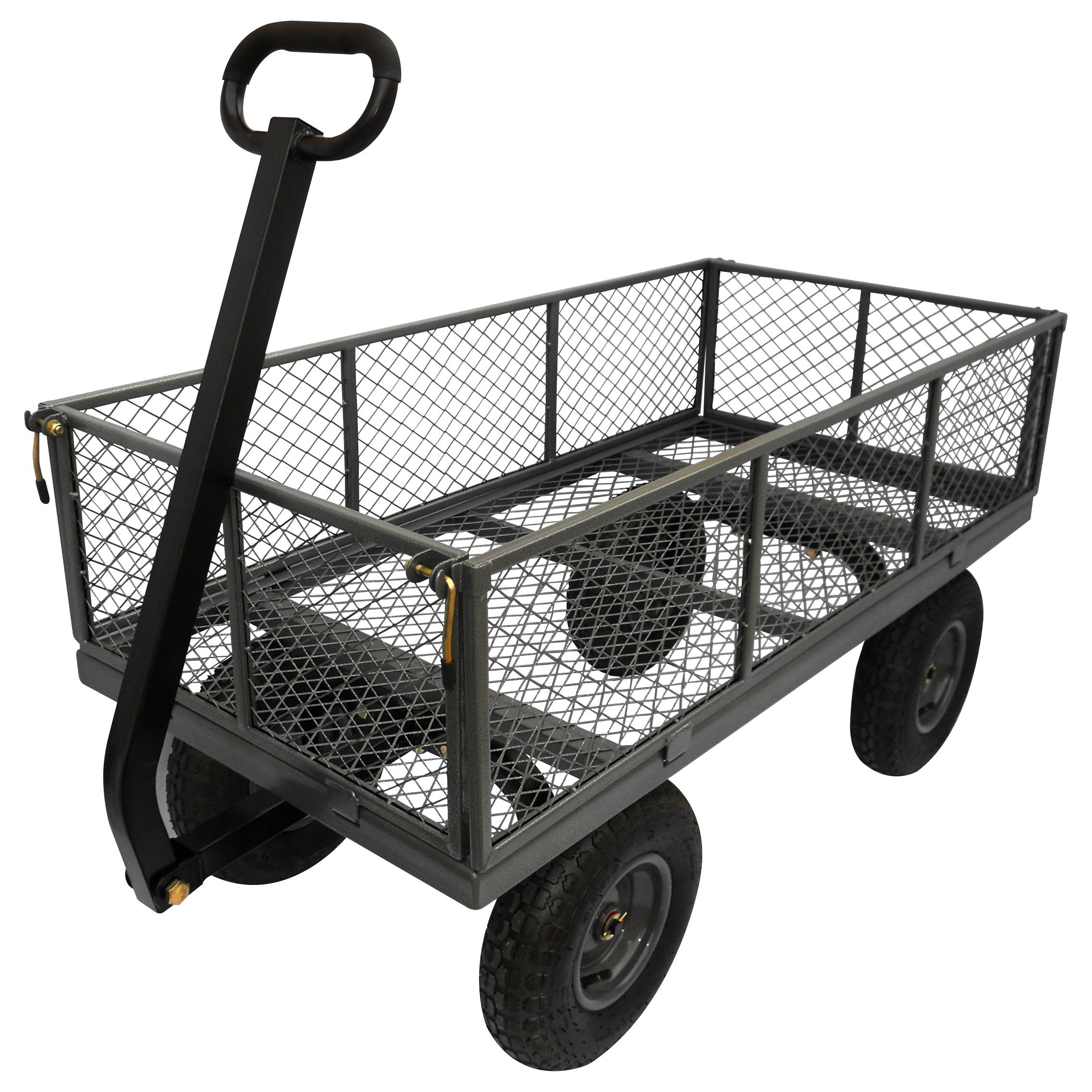 This Landscapers Select Garden Cart has a load capacity of 1200 lb (550 kg) and a steel pull handle measuring 30 in x 7/8 in Dia. The 13 in x 4 in pneumatic wheels have steel rims, 6 in hubs, and fit 5/8 in axels. Heavy-gauge steel construction with reinforced sides for greater strength. Easy-to-operate pins allow the sides to be locked upright, folded down or removed for transporting oversized items. Mesh body bed. Use Sku 8925026 for a replacement wheel.
