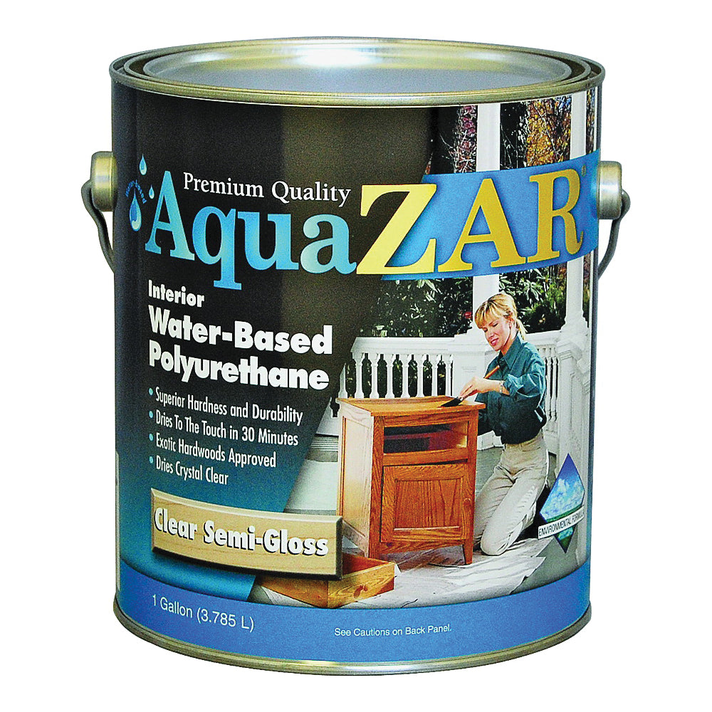 This non-yellowing, environmentally safe, clear wood finish is specially formulated to protect and beautify cabinets, furniture, shiplap paneling, woodwork and floors. As it dries crystal clear, you can use it over light colored or white stains with confidence. Aqua ZAR® water-based polyurethane is exotic hardwood approved and is ideal for use on teak, Brazilian walnut and other similar wood species. Aqua ZAR® water-based polyurethane combines the beauty and durability of an oil-based polyurethane with the environmental benefits of a water-based clear finish. The fast drying, low odor formula resists most household chemicals and abrasions. The product's full-bodied formula brushes on like conventional polyurethane for maximum durability and beauty. Aqua ZAR® water-based polyurethane meets all environmental standards for low emission of solvent vapors.