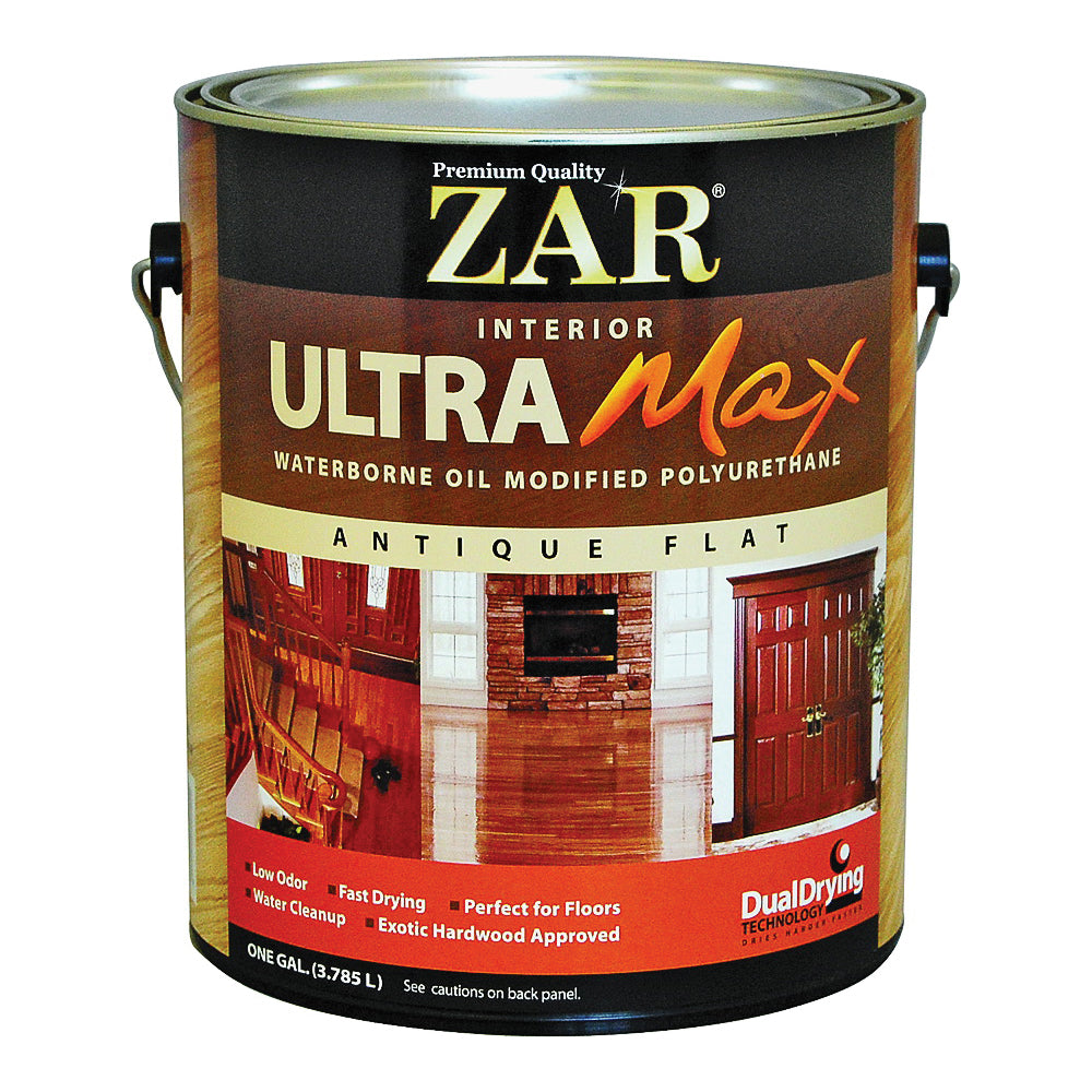 ZAR® ULTRA Max polyurethane features dual drying technology for a harder "through cure". Since you can recoat in just 2 hrs, it's the ideal choice for heavily used areas. Self-leveling properties make it ideal for creating smooth finishes on floors, cabinets, furniture and woodwork. The low odor formula offers excellent hardness and mar resistance and delivers outstanding wear and durability. ZAR® ULTRA Max polyurethane cleans up quickly and easily with soap and water. Environmentally safe, ZAR® ULTRA Max polyurethane is exotic hardwood approved and ideal for use on Teak, Brazilian Walnut and other similar wood species. Natural ambering enhances wood tones.