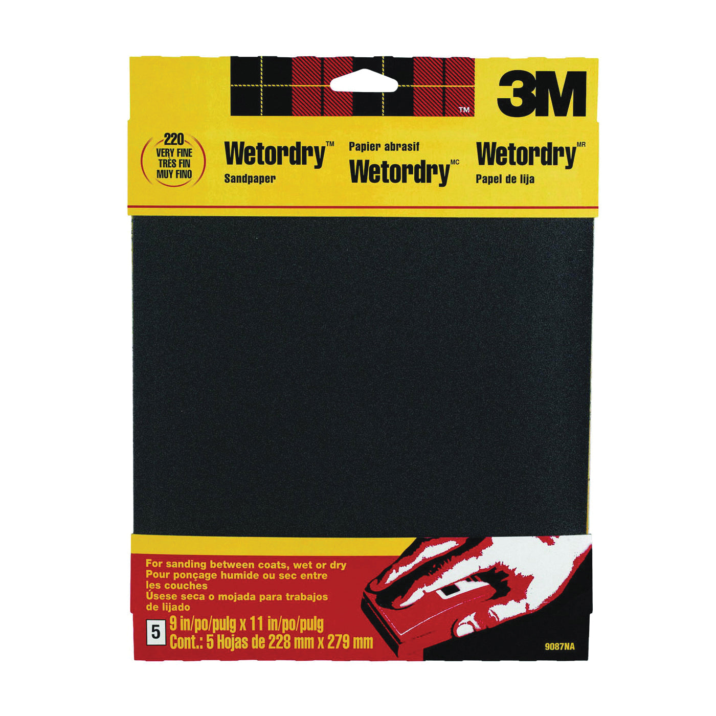 • 3M 9087 Sandpaper, 11 in L, 9 in W, 220 Grit, Very Fine, Silicone Carbide Abrasive