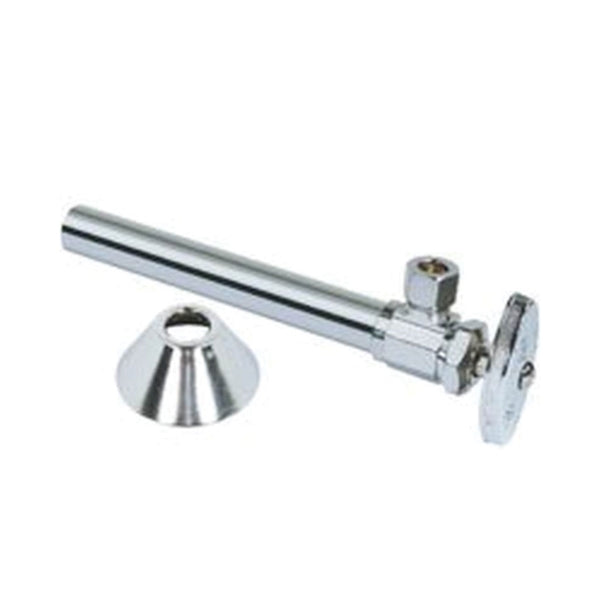 BrassCraft® 1/2 in nominal sweat inlet x 3/8 in OD compression outlet multi-turn angle valve with 5 in sweat Extension Tube and Bell Escutcheon controls water flow to household plumbing fixtures like faucets, toilets, dishwashers, icemakers, washing machines. The angle valve is most often used where the water pipe enters the room from the wall. With a few turns of the valve handle, you are able to stop or start the flow of water leading to the plumbing fixture, allowing for maintenance and repair without shutting off water to the entire home.