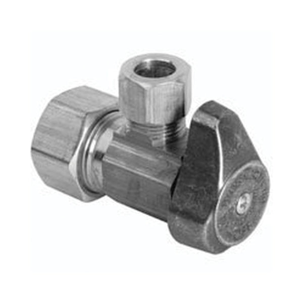 BrassCraft® 1/2 in Nom compression inlet x 1/4 in OD compression outlet 1/4-turn angle valve controls water flow to household plumbing fixtures like faucets, toilets, dishwashers, icemakers, washing machines. The angle valve is most often used where the water pipe enters the room from the wall. With a 90 deg turn of the valve handle, you are able to stop the flow of water leading to the plumbing fixture, allowing for maintenance and repair without shutting off the water to the entire home.