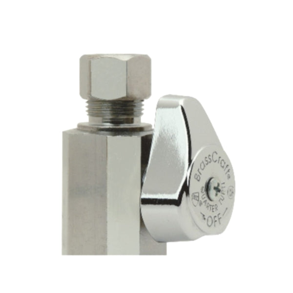 BrassCraft® 1/2 in FIP inlet x 3/8 in OD compression outlet 1/4-turn straight valve controls water flow to household plumbing fixtures like faucets, toilets, dishwashers, icemakers, washing machines. The straight valve is most often used where the water pipe enters the room from the floor. With a 90 deg turn of the valve handle, you are able to stop the flow of water leading to the plumbing fixture, allowing for maintenance and repair without shutting off the water to the entire home.