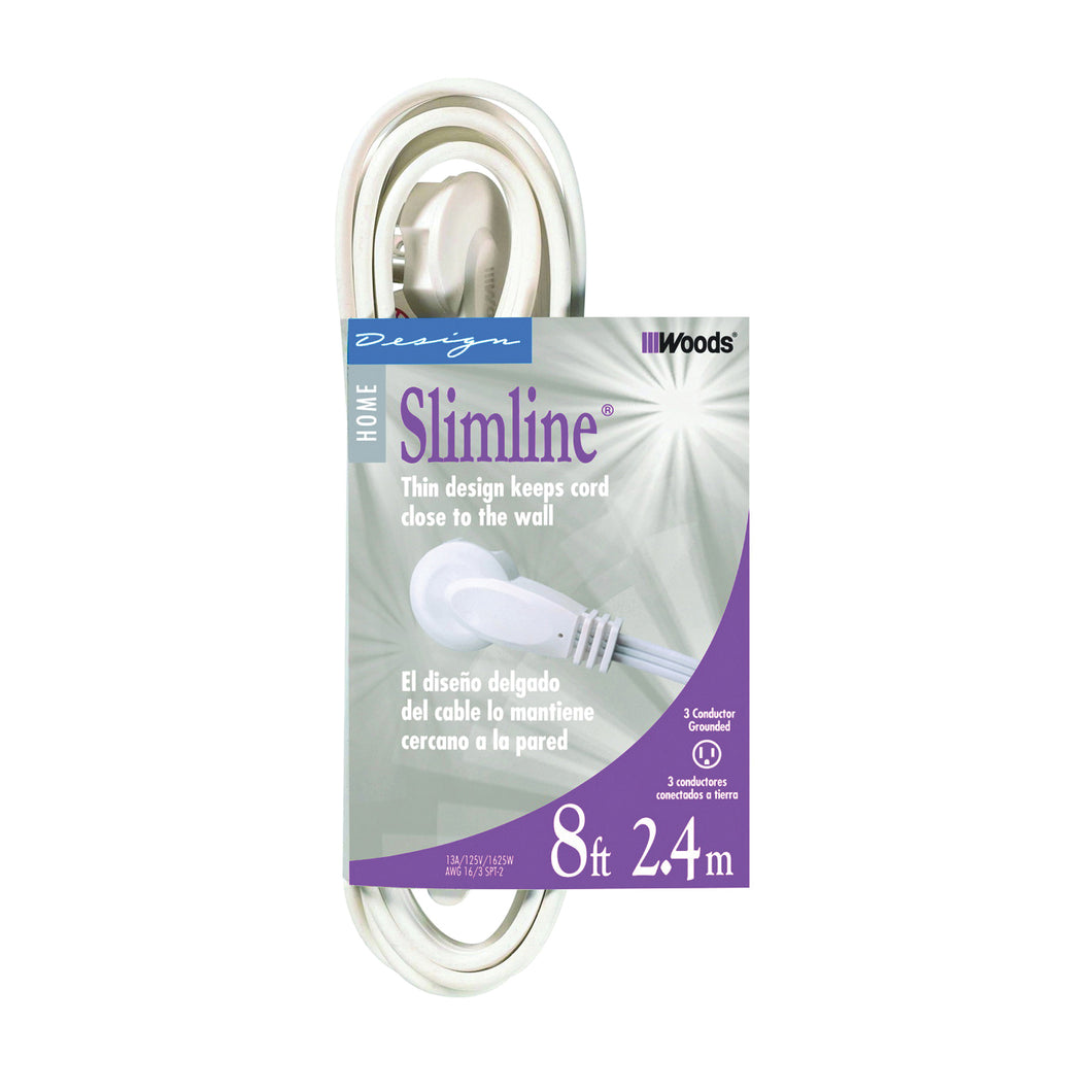 Indoor only, household cord. Thin male plug keeps cord close to wall. Plug does not block other outlets. White, 13 A/125 V. UL Listed. Sleeved.