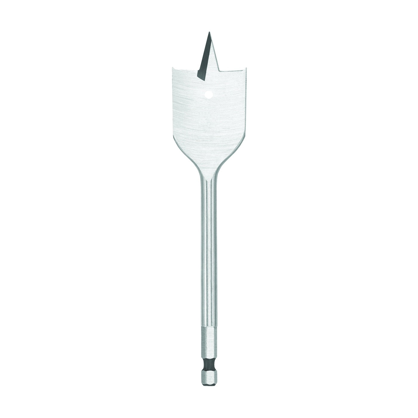 Featuring a heavy-duty, full-length, heat-treated shank for protection against bends and breaks, DeWALT® spade bits are equipped with high-performance cutting spurs for optimum hole finish. An extreme speed channel provides fast chip removal and a 1/4 in ball groove shank offer quick-change applications. A 1/4 in hex shank helps to prevent slippage and a hang hole enables easy storage and wire pulling.