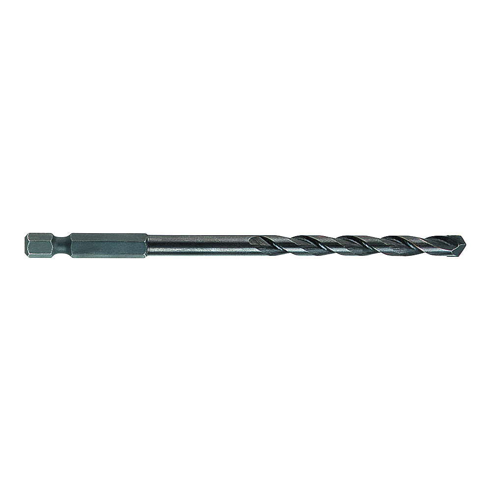 Carbide tipped bit with rapid load quick change used in applications such as drilling in brick, block and concrete, 1/4 in universal hex shank prevents slipping.