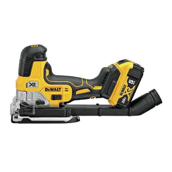 Our 20 V MAX* XR Cordless Barrel Grip Jig Saw features an efficient motor for powerful performance and extreme runtime. Precisely control blade speed up to 3200 spm with the variable speed trigger and dial, for professional results no matter what you're cutting. 4-position orbital action lets you adjust for optimal cutting of a variety of materials. A bright LED light illuminates dim work surfaces and makes it easy to follow cut lines. The updated all metal, lever action keyless blade clamp is designed for quick and easy blade changes of t-shank jig saw blades. Also keyless, the shoe bevel is easy to adjust with detents at 0, 15, 30 deg a positive stop at 45 deg. A removable shoe cover helps protect materials from scratches and an integrated dust blower helps remove dust and debris from your line of sight as you cut.