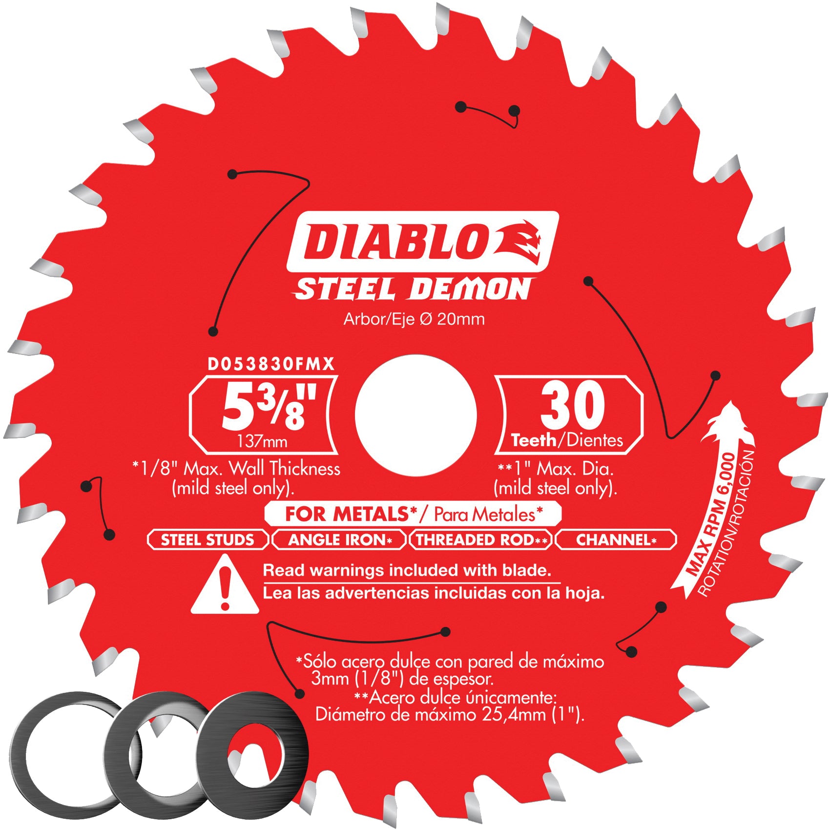 Diablo Saw Blade, 5-3/8 in Diameter, Carbide Cutting Edge, TCG Teeth, 30 Teeth, 20 mm Arbor, 2 deg Hook Angle, 0.059 in Kerf, Applicable Materials: Iron, Steel, Suitable for: Milwaukee 20 mm, 10 mm Arbors, Bosch 20 mm Arbor, Panasonic 20 mm Arbor, Makita 5/8 in Arbor, Skil 5/8 in, 1/2 in Arbor, DeWALT 10 mm Arbor