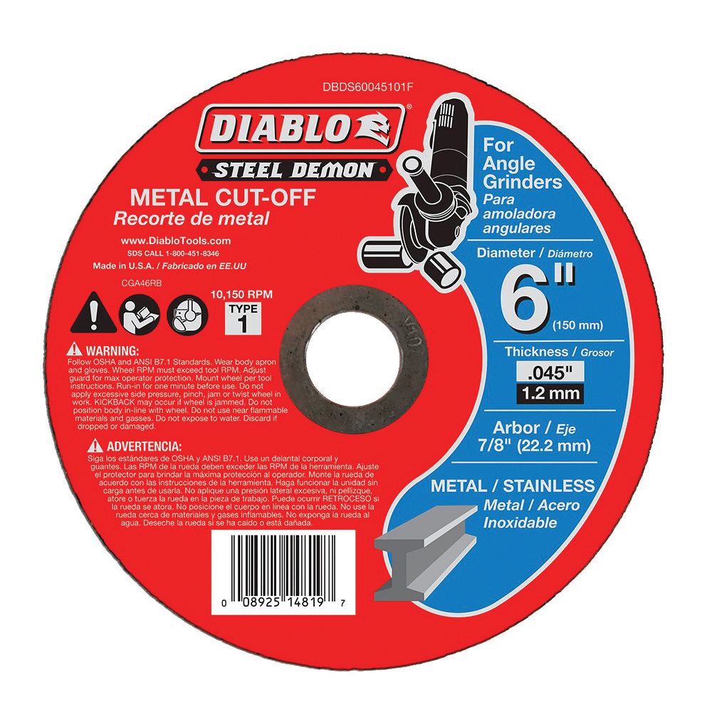 Diablo's steel demon metal cut-off discs deliver industrial performance, increased productivity and longer cutting life. Featuring a premium ceramic blend that produces quick cuts that deliver up to 6X longer life. Fully reinforced for hand-held work, these discs are ideal for cuts and working in hard-to-reach areas.