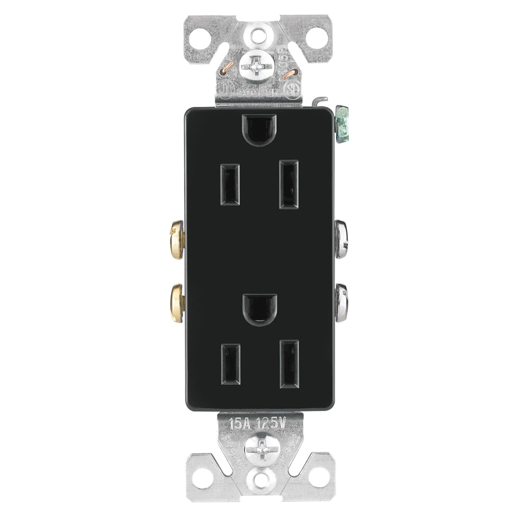 Decorator Receptacles with autoground feature longer, wider straps providing 40% more contact area to wall board. Virtually eliminates floating installations. Patented built-in wire stripper for #14 and #12 wire to speed installation. Patented built-in wire looper for pre-looping. Tri-combo screws accept slotted, Phillips and Robertson-head tools for installation flexibility. Terminal screws backed out - ready for wiring. Side wire terminals accept up to #10 solid or stranded wire. Push-in terminals accept #14 solid wire.