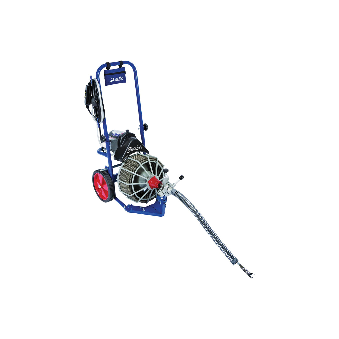 Includes standard five-piece tool set. Unit is built on heavy-duty steel frame with folding handle for easy transport and storage. Power cord is wrapped around conveniently placed brackets for safe, problem-free transport. Ground fault circuit interrupter (GFCI) safety feature comes standard with 20 ft power cord. Easy-to-use air operated foot switch allows the use of both hands when working with cable. Impact-resistant plastic belt guard for additional operator safety. Built-in drum shaft slip clutch minimizes cable and tool breakage and provides overload protection. Unique inner drum design eliminates cable buckling. Cable is 1/2 in certified music wire with genuine galvanized aircraft wire inner core for longer life. Cast aluminum bracket with bearing supported guide tube. Fully open cage for easy cable inspection and cleaning. Large 10 in wheels for better maneuverability. Wheel brake stabilizes unit while in operation. Rugged 1/3 hp reversible Baldor motor delivers plenty of speed cleaning power. Handy tool bag provides convenient storage of tools with unit.