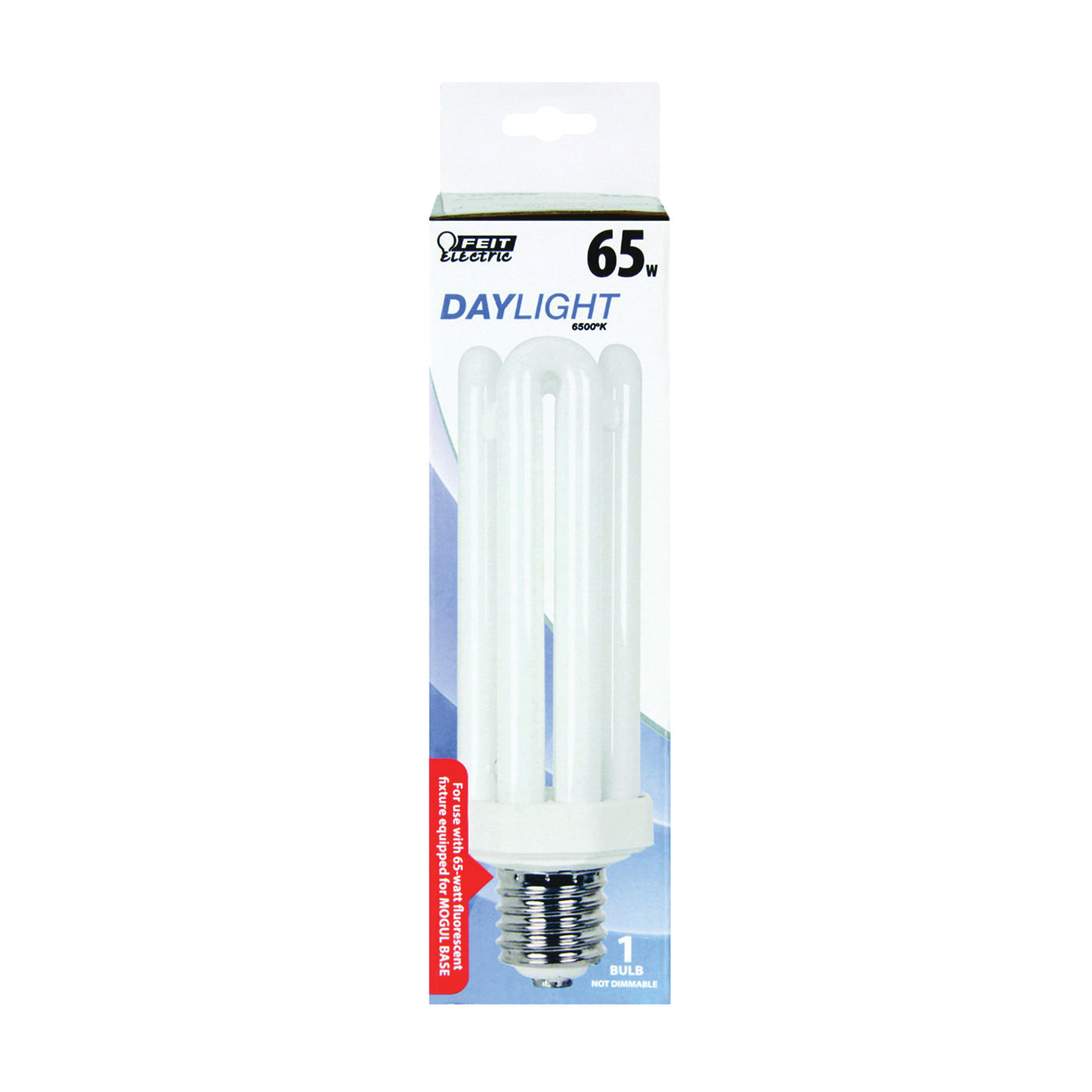 The PLF65/65 65 W Feit Electric CFL PL replacement natural daylight bulb is non-dimmable and will replace a 300 W equivalent incandescent bulb. It produces a similar light output of 4550 Lumens, uses 65 W of electricity and up to 76% less energy than a standard incandescent light bulb. This compact fluorescent light is ideal for recessed fixture applications. Feit Electric CFL bulbs have a relatively cool running performance, an average life of 10,000 hrs/9.1 years and are FCC compliant. Choose a dependable, Energy Star® approved general-purpose bulb for residential or commercial applications.