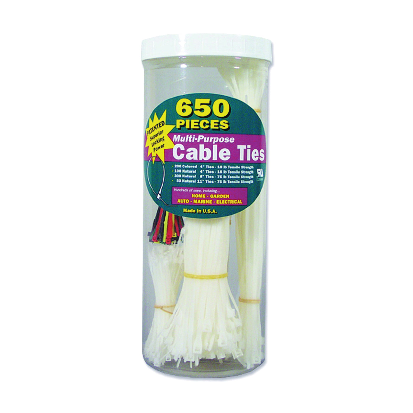 Reseal able canister contains 100 18 lb 4 in natural, 200 18 lb 4 in red, black, green, yellow, 300 75 lb 8 in natural with "D" lock and 50 75 lb 11 in natural with "D" lock.