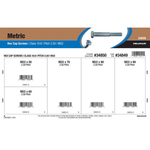 An assortment of class 10.9 metric hex cap screws from The Hillman Group. Hex cap screws or hex bolts are perfect for most applications in which a stronger, sturdier bolt is desired. A common feature on hex cap screws is a washer surface directly under the head which creates a better seal. Included variants feature a coarse M22-2.5 thread size and range from 50 to 90 mm in length.