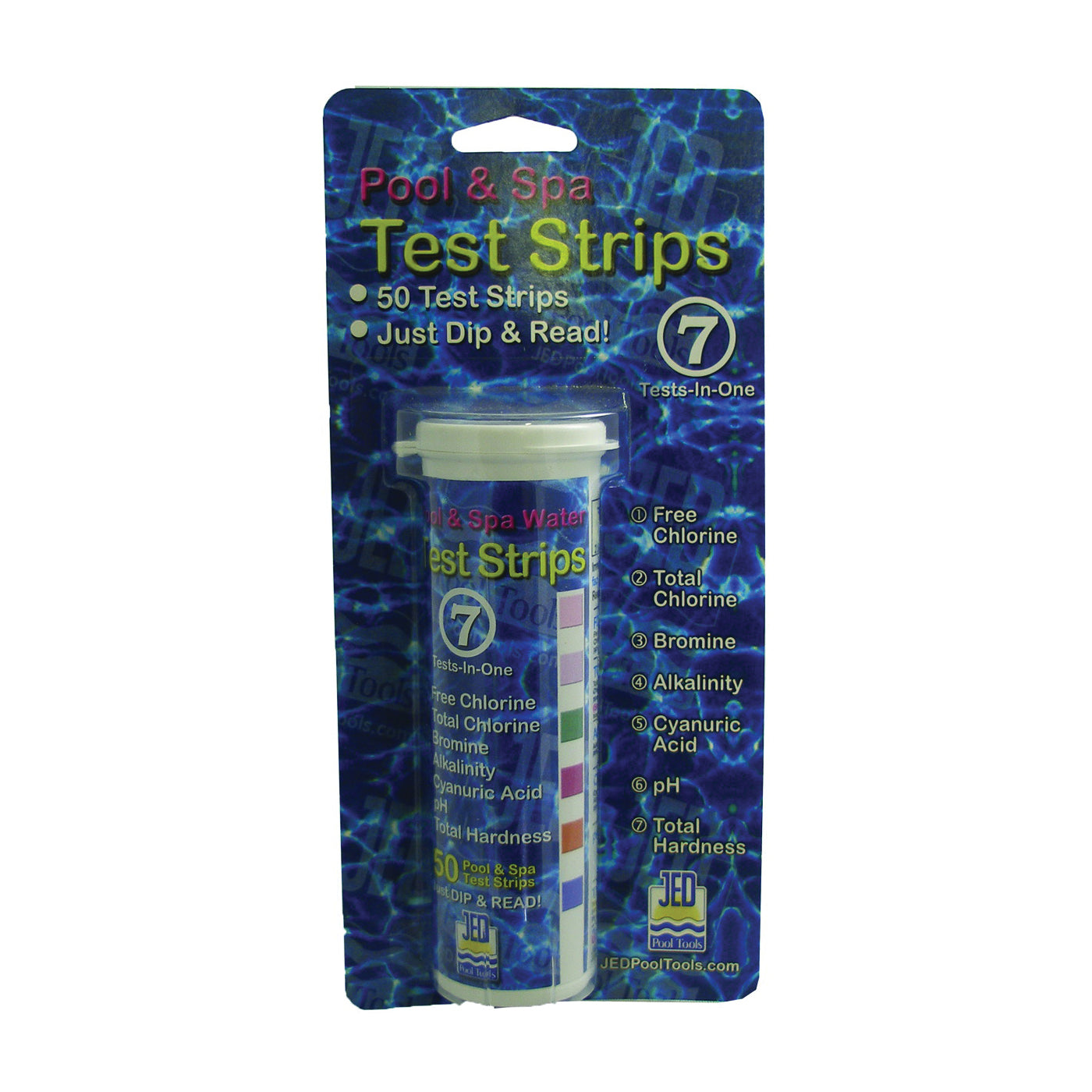 For pools and spas. Just dip test strip in your pool or spa water for one sec and remove. Strip gives instant results. Tests for free chlorine, total chlorine, bromine, pH, total akalinity, hardness and stabilizer (CYA). Contains 50 strips.