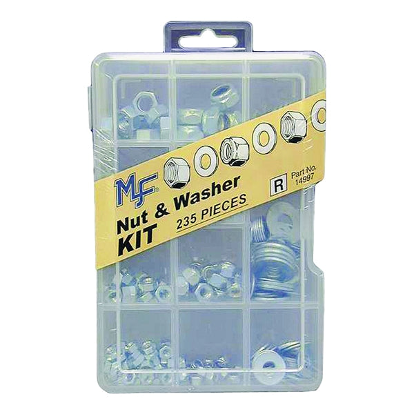 | Includes | (60) #10-24 Grade 2 Hex Nuts, (20) 1/4-20 Grade 2 Hex Nuts, (10) 5/16-18 Grade 2 Hex Nuts, (8) 3/8-16 Grade 2 Hex Nuts, (16) #16-24 Nylon Insert Locknuts, (15) 1/4-20 Nylon Insert Locknuts, (8) 5/16-18 Nylon Insert Locknuts, (5) 3/8-16 Nylon Insert Locknuts, (25) 1/4 in Flat Washers, (50) #10 USS Flat Washers, (8) 3/8 in USS Flat Washers, (10) 5/16 in USS Flat Washers |