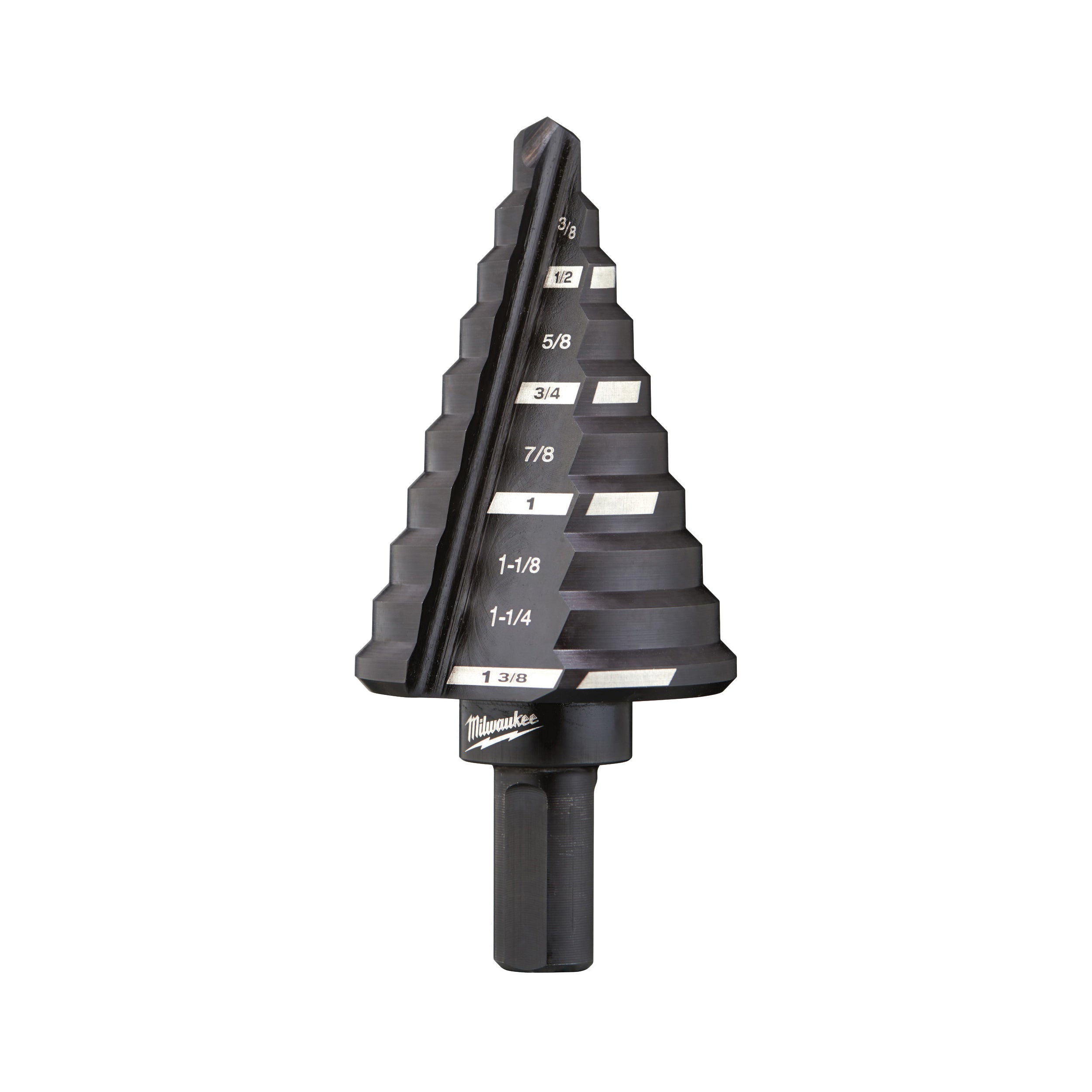 Milwaukee® step drill bits with jam-free performance feature a dual flute design delivering up to 2X faster hole times, up to 4X longer life and up to 50% more holes per battery charge than competitors. Ideal for drilling small and large diameter holes in steel and plastic, these bits are optimized for cordless drills in high speed. The Rapid Strike™ tip allows for a fast and accurate start that generates less heat, resulting in longer bit tip life. Black oxide coating also enhances durability, hole quality and bit life. For user convenience and accuracy, each bit has laser-engraved reference marks you can see while drilling. The three-flat Secure-Grip™ shank ensures a solid connection with the drill chuck. The #5 step drill bit has 10 hole sizes in 1/8 in increments ranging from 1/4 to 1-3/8 in. Jam-free performance in high-speed with most professional 18 V cordless drills with Lithium-Ion battery technology.