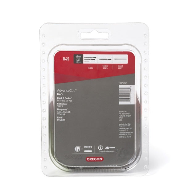 The Oregon R45 AdvanceCut™ saw chain is a 12, 3/8 in pitch chain that is ideal for landscapers and homeowners using small, low powered saws. The 0.043 in ga narrow kerf cutting systems increase efficiency since they need less power from the saw than standard cutting systems.