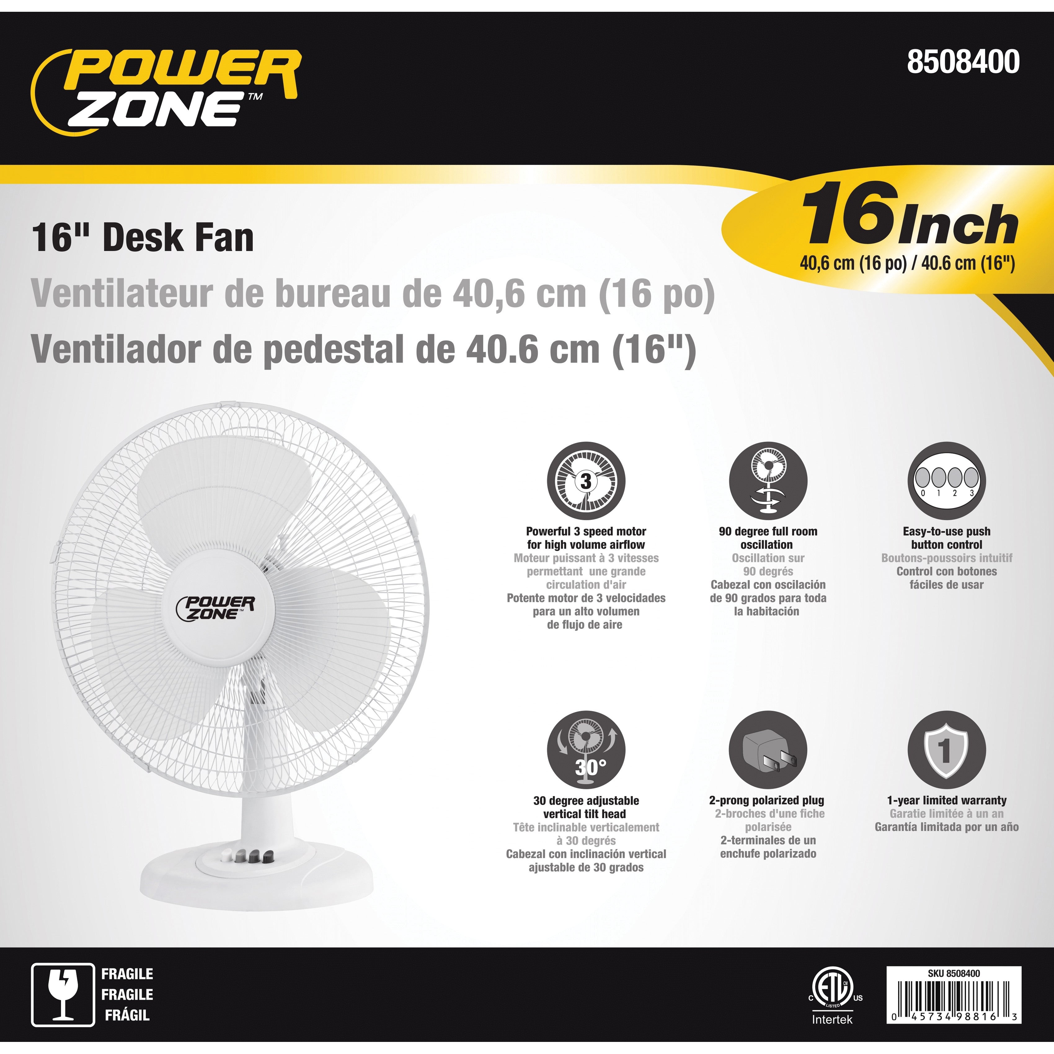 3 speed energy saving motor. 90 deg full room oscillation. 45 deg vertical tilt. Safety radiant grill. Push-button controls. ETL & cETL Listed for safety. White.