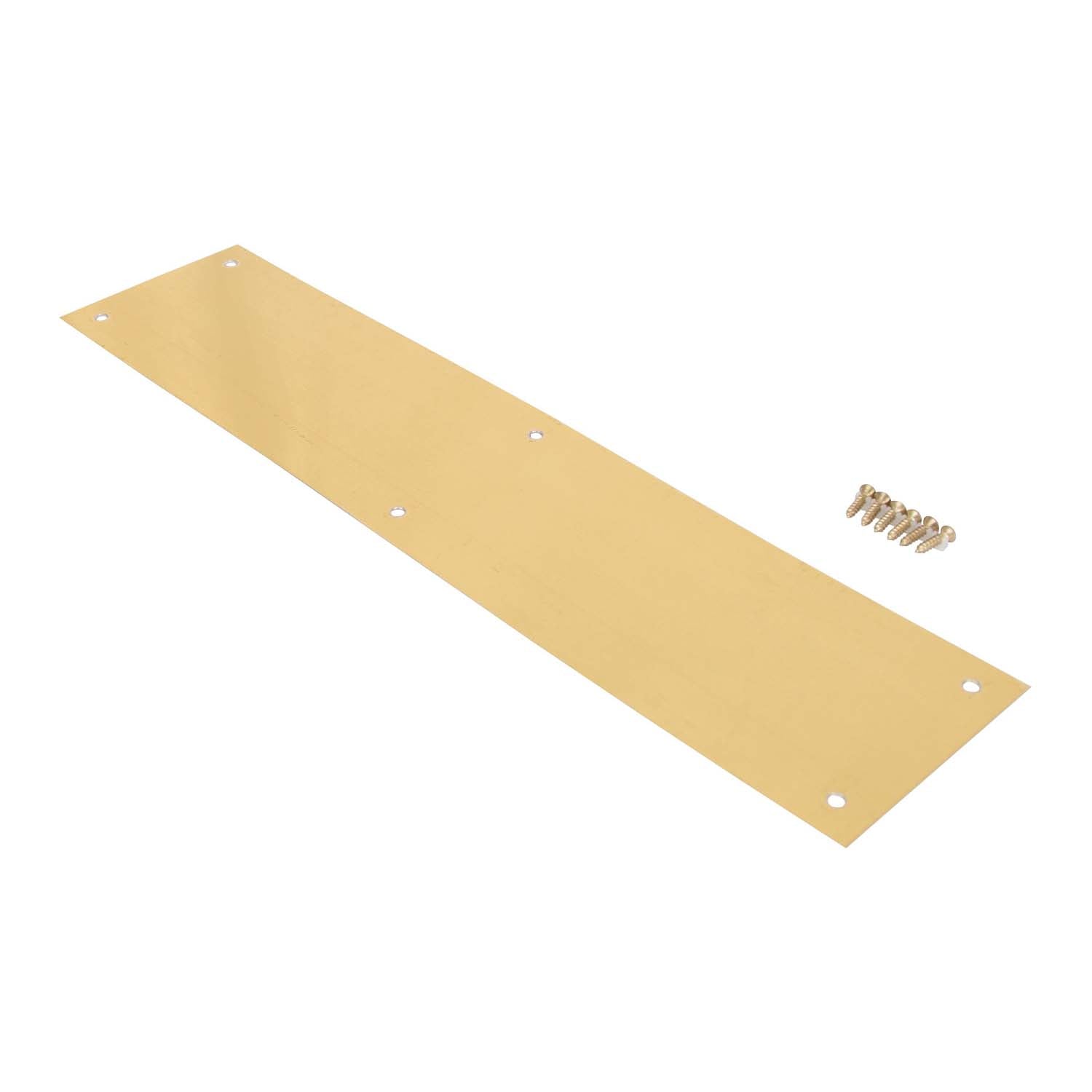 Designed to protect the surface on commercial and residential doors. Pre-punched mounting holes. Fasteners included. Aluminum material. Brass finish. Size:15 in L, 3-1/2 in W.