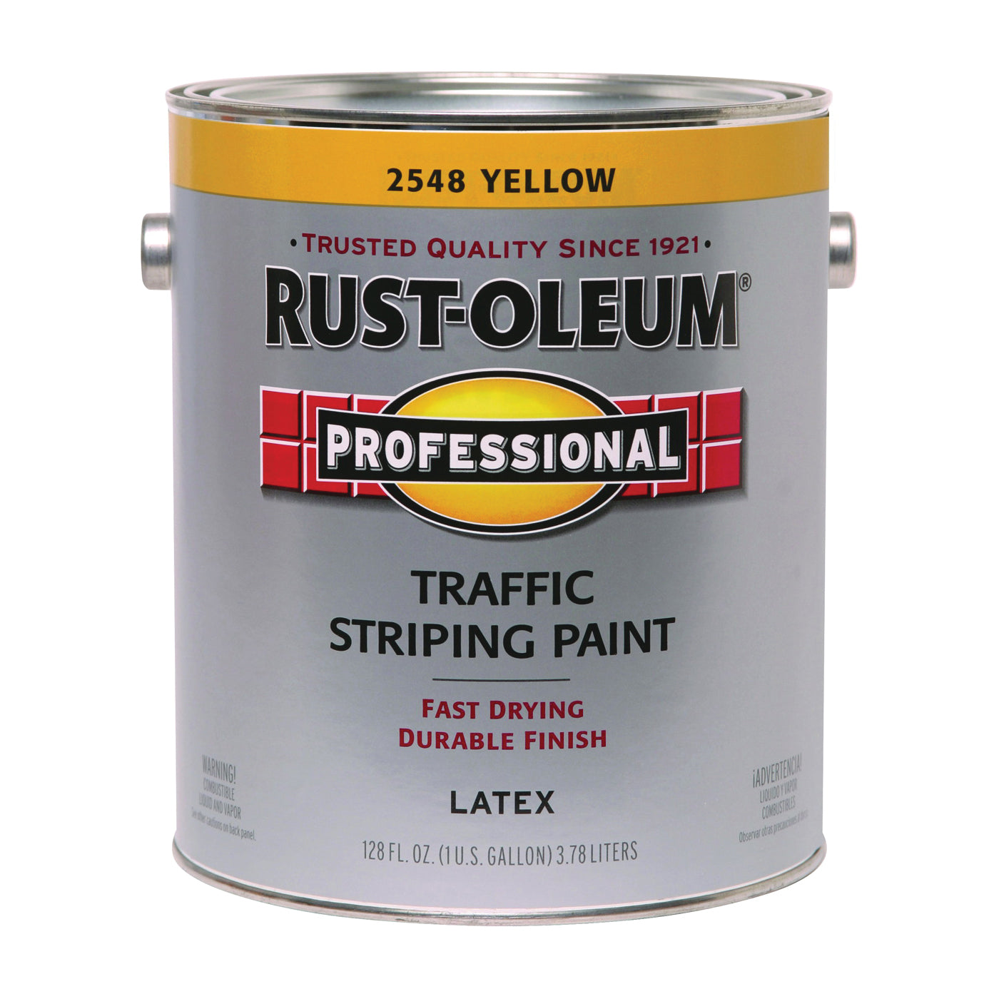 RUST-OLEUM® PROFESSIONAL traffic striping paint is a single-component, latex coating. Dries fast (in 30 min) and can accept traffic after 8 hr. Use for large striping jobs on interior or exterior concrete or asphalt surfaces such as large commercial parking lots, curbs or aisles.