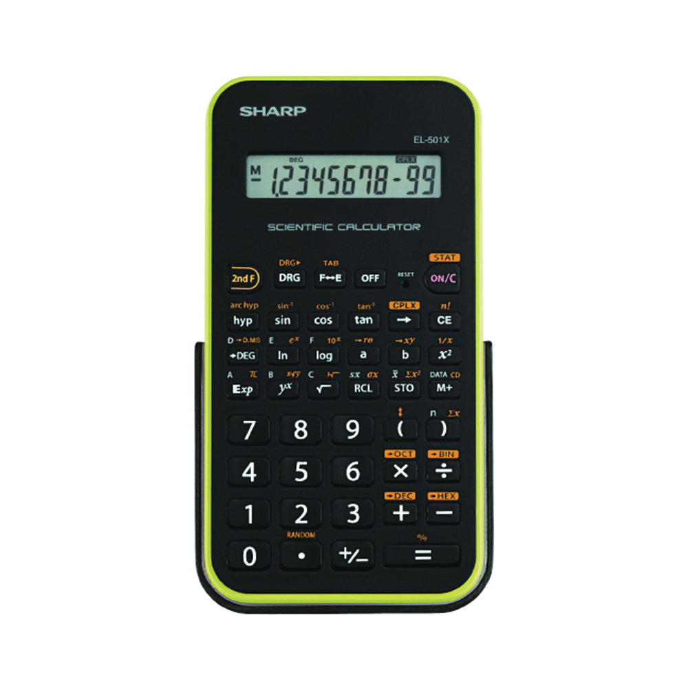 EL-501XBGR model is ideal for students studying general math and science, pre-algebra, algebra and trigonometry. This green calculator performs 131 essential scientific, math and statistic functions. The EL-501XBGR utilizes a standard 1-line display featuring normal, stat and complex modes, N-BASE calculations such as OCT, BIN, DEC and HEX as well as one independent memory. Other features include logarithms, reciprocals, powers, roots, factorials, trigs, hyperbolic trigs and one variable statistical calculation. Includes protective hard case and operates on a battery source.