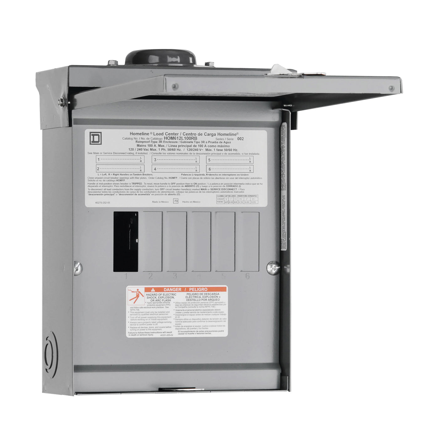 Outdoor main lug load center, 100 A, 6 space and 12 circuits. Can be wired for underground or overhead feeds with a 2-1/2 in hub on the top and a 1-1/2 in knockout on the bottom. NEMA type 3R enclosure resists rain for durable performance. ANSI certified and UL listed.
