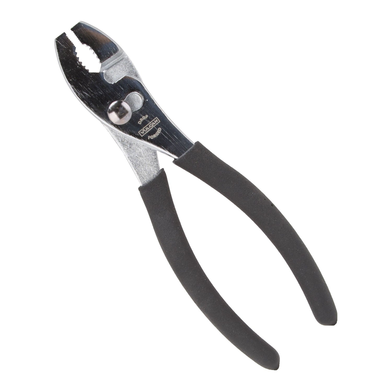 The Vulcan slip joint plier jaw material is made from carbon steel with a chrome-plated jaw finish. The handle color is black. Overall length is 8 in.
