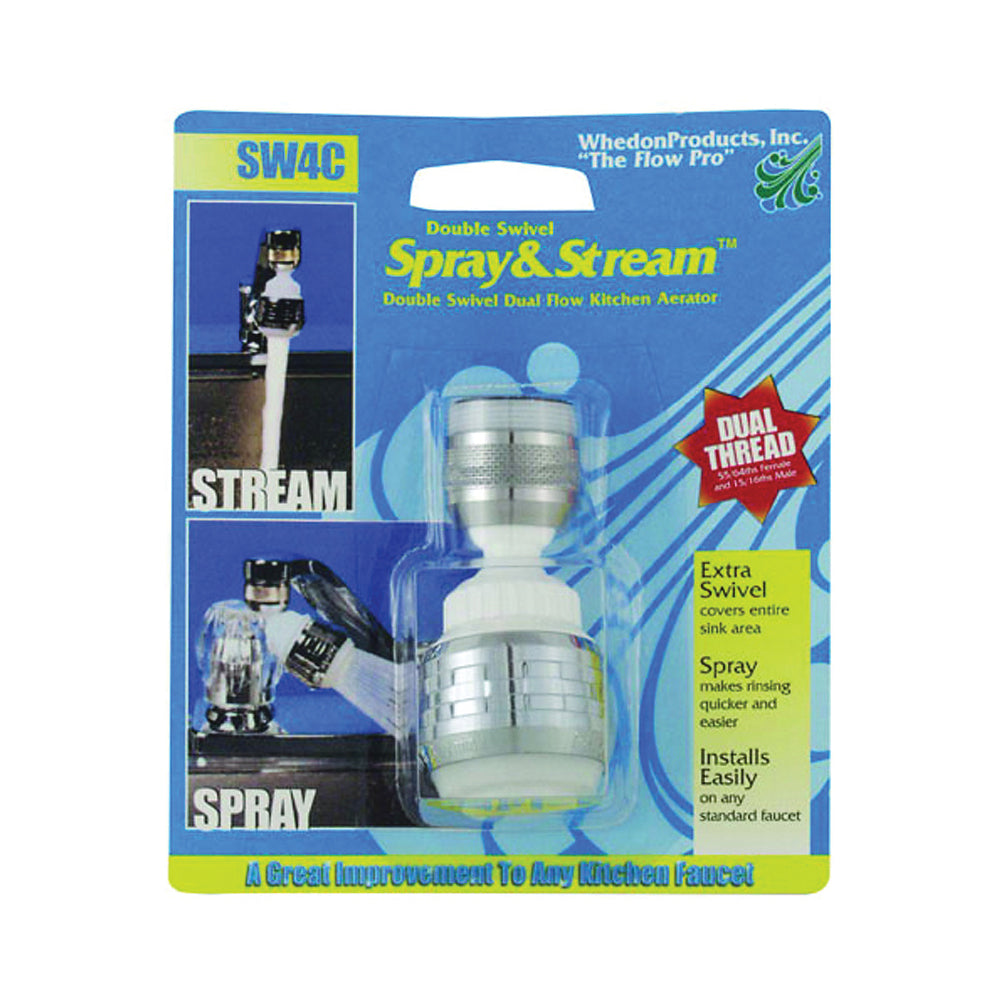 Italian made better quality swivel, spray and stream aerator. Two plastic swivel joints for extra sink coverage. Spray or stream body provides two types of flow. Installs easily on most kitchen faucets with standard female brass thread or plastic male adapter. Lead-free.
